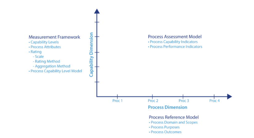 ASPICE有自己的工艺参考模型(PRM),它是针对汽车行业的具体需求而量身定制的。这个ASPICE过程评估模型(PAM)在进行评估时使用PRM。在ASPICE中,能力确定是基于一个二维框架:过程维度和能力维度。