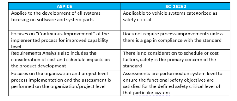 由于ASPICE涵盖了更广泛的系统开发主题,实施ASPICE可以为实现ISO 26262的要求提供一个框架。ASPICE与ISO 26262的主要区别如下: