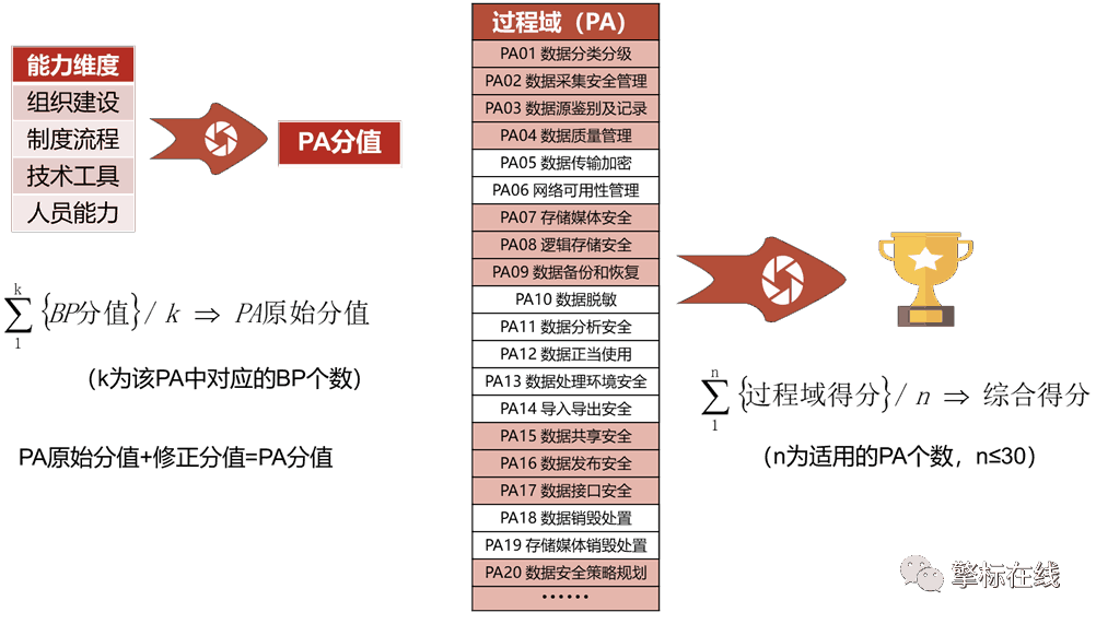 DSMM的评价方法主要是评分制,先对每个过程域(PA)的四个能力维度(BP)进行打分,再通过计算平均分、修正分值的方式得到最终的PA分值,最终得到整体的综合得分。