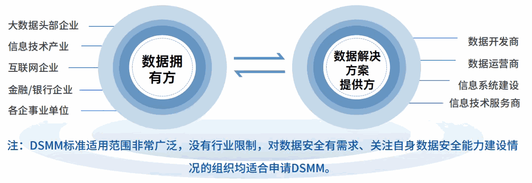DSMM标准的适用范围非常广泛,没有行业的限制,对数据安全有需求、关注自身数据安全能力建设情况的组织均适合申请DSMM,包括但不限于数据运营组织、数据处理组织、数据服务提供组织等。